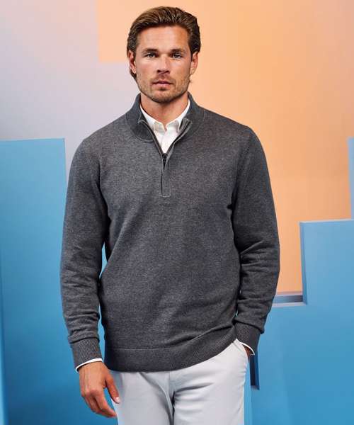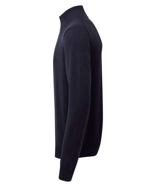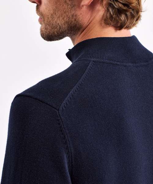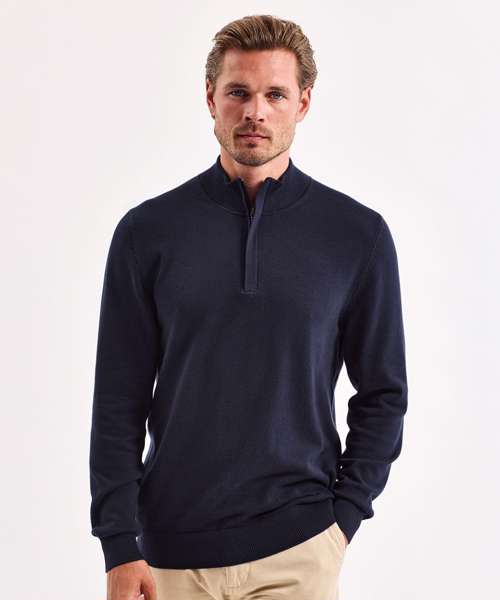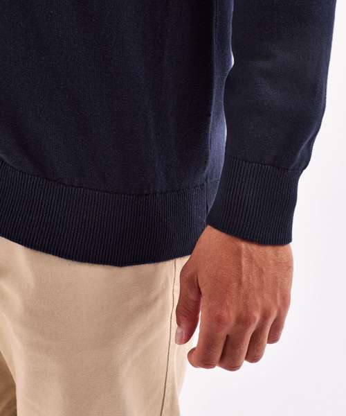 ΒΌ zip sweater. Decorative tuck stitching. Ribbed knit on the cuffs and hem. Product contains no branded neck label. Removable Kimble or looped garment tags. Inner seam label holds important product information on one label with a second label containing brand information which can be cut-away. Please note old stock may contain a fixed branded label.