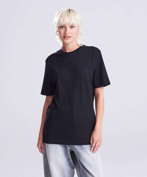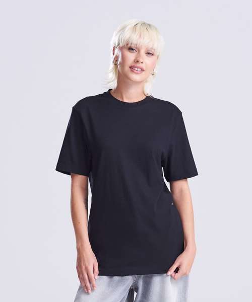 Relaxed fit T. Short sleeves. Side seams. PurePrint BC Cotton fabric. Taped back neck. Twin needle stitch details. Ribbed crew neck.