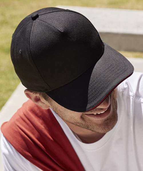 Contains 100% certified, organically grown cotton. 5-panel design. Contrasting colour sandwich peak. Stitched ventilation eyelets. Contrasting colour tri-glide adjuster. TearAway label for ease of rebranding.