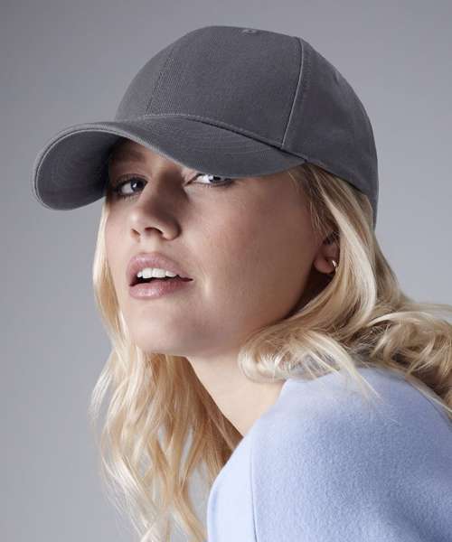 TearAway label for ease of rebranding. 6-panel design. Pre-curved peak. Stitched ventilation eyelets. Perfect for print and embroidery. Rip-Strip™ size adjuster.