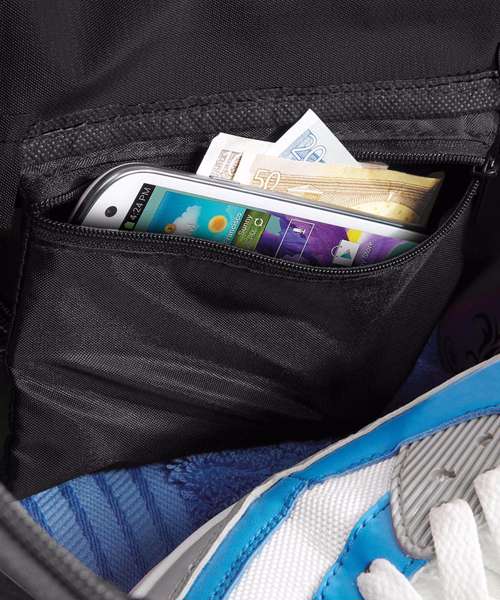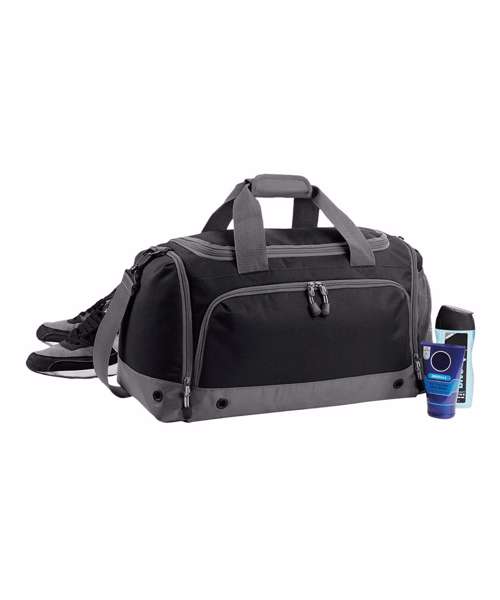 TearAway label for ease of rebranding. Water-resistant fabric. Detachable adjustable shoulder strap with pad. Shoe tunnel. Wet pocket. Internal valuables pocket. External mesh pocket. Zippered end pockets. Protective base feet. Metal ventilation eyelets. Padded hand grip.