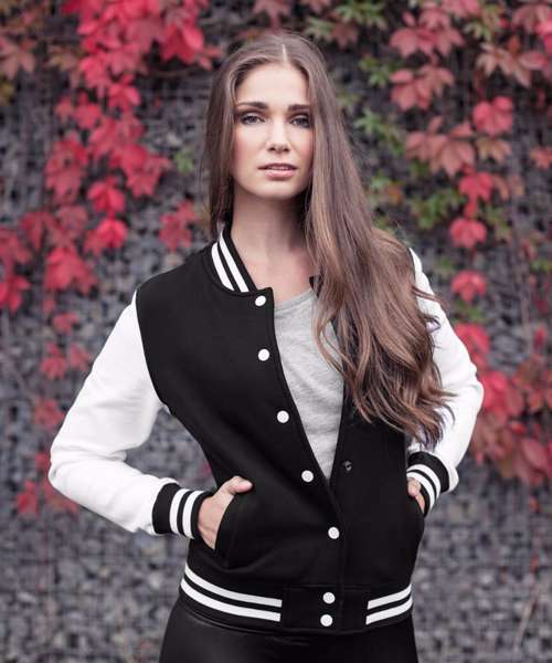 The college style presents itself as a cool stylish women's jacket with contrasted cuffs to offer a preppy look and feel. The inside brushed sweat fabric ensures a comfortable fit. Typical details include; striped rib cuffs at the collar, hem and sleeves and metal press-buttons to emphasise the cool look. Two pockets on the front, set-in sleeves and neck half-moon with neck tape. This item is manufactured in a FAMA Certified factory. FAMA stands for Facility and Merchandise Authorisation and is a high standard production certificate.