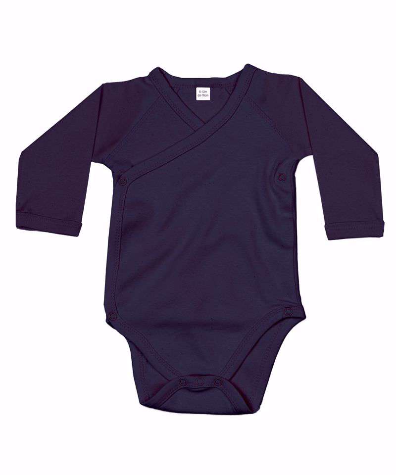 Wrap-over, kimono-style bodysuit. Nickel-free pop fasteners at side for ease of dressing. Nickel-free snap poppers at leg opening. Binding around neck, sleeve ends and leg openings for shape retention. Long raglan sleeves. Tear-off size label at back neck. Care label with QR code to follow supply chain and check positive impact of buying organic. Care label made from organic cotton. Oeko-Tex certified. Vegan certified. GOTS certified.