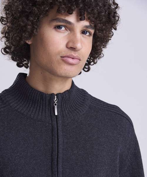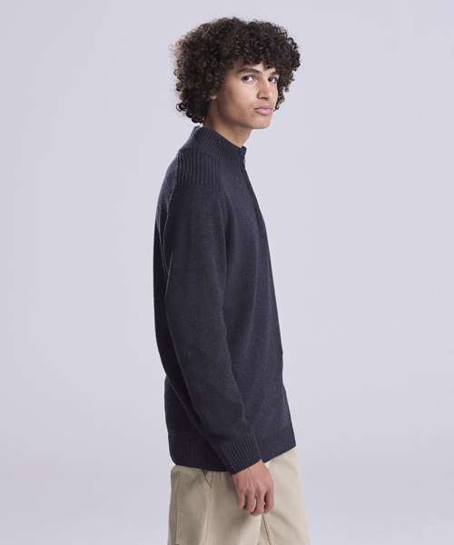 Long sleeve sweater made from regenerated cotton with tall collar and ¼ zip neck. Contrast rib stitches at shoulders cuff and hem.