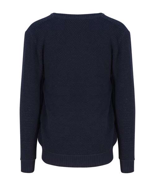 Regenerated cotton blended with recycled polyester sweater. Seed stitch knit with rib neck, cuffs and hem.