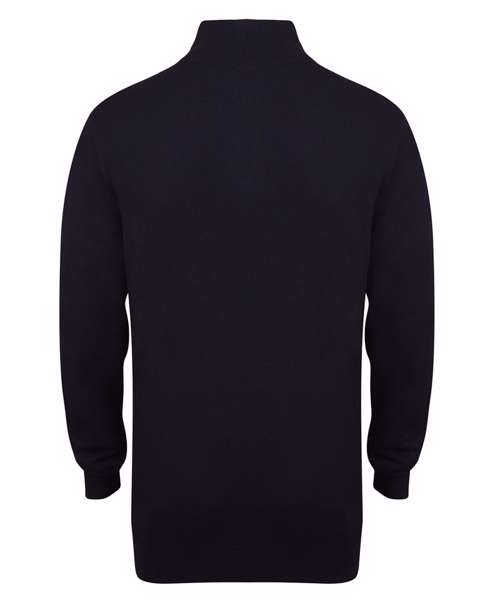 Fine knit, 12 gauge in quarter zip jumper. Semi-fashioned sleeve with 1x1 quarter zip neck rib, hem and cuffs. Henbury cut-out brand label. Metal zip and puller.