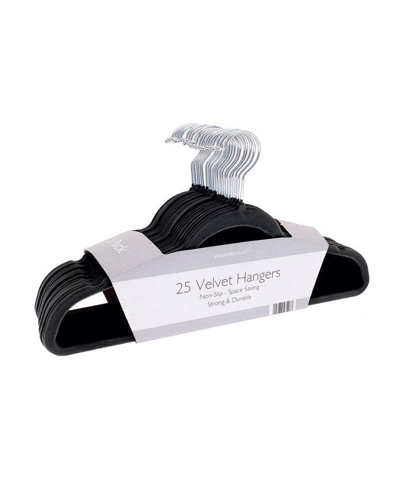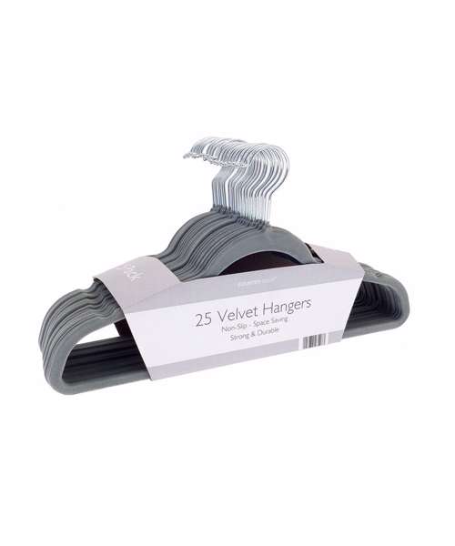 Pack of 25 non-slip, soft-touch, velvet-effect coat hangers with swivel hook. Strong and durable.