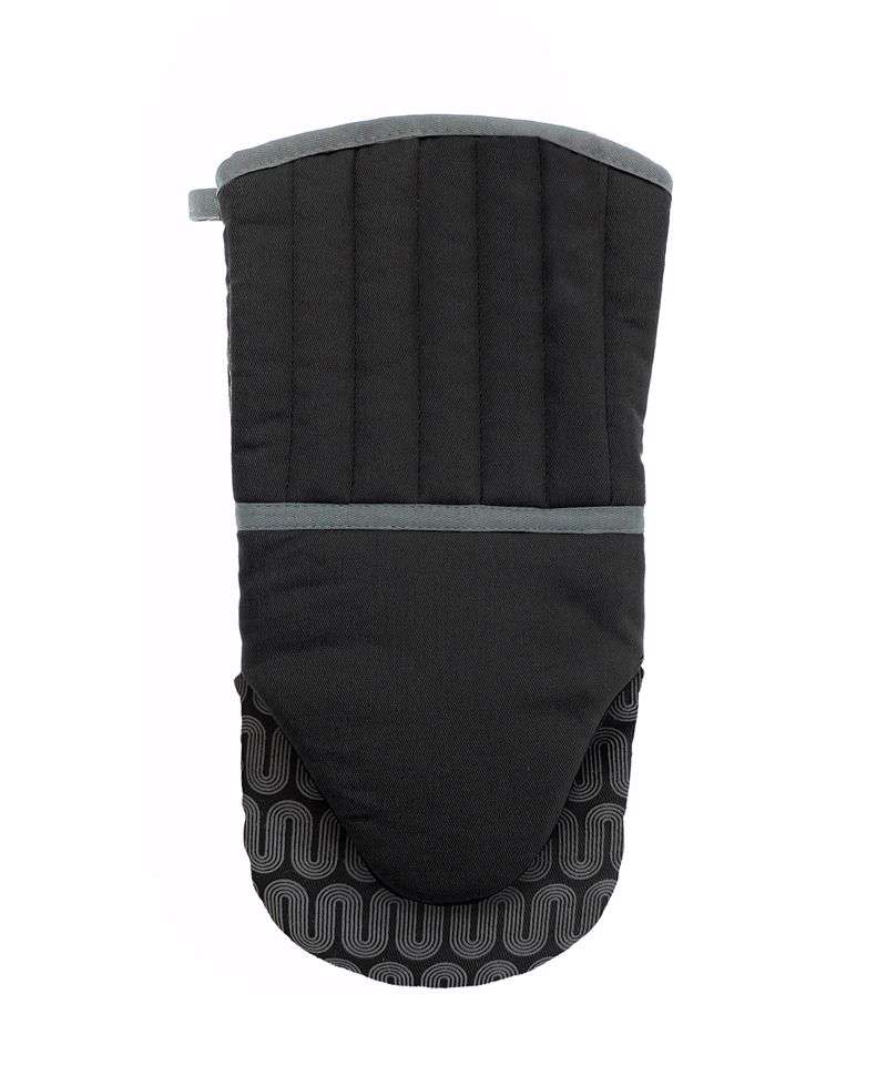Oven mitt with silicone grip. The finger has a soft yet super-strong texture, with good slip resistance, for a firm grasp. It can easily be cleaned with warm soapy water, or machine-washed.