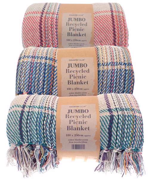 This jumbo-sized, recycled cotton picnic blanket is perfect for enjoying a day out at the beach or a relaxing picnic in the park. Each blanket is made from recycled materials, so colour and design may vary.