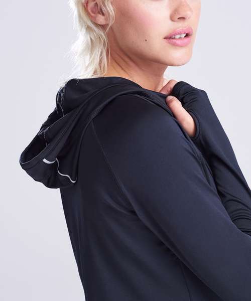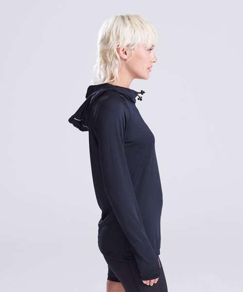AWDis’ own CoolFit blended fabric containing elastane that provides stretch for comfort and a great fit. Cowl neck style hood. Sporty fit. Ideal for layering. Raglan sleeve design creates ease of movement. Reflective elements on hood for low light conditions. Reflective tab on back of neck helps keep ear phone cords in place. Toggled hood. Flat-lock stitching detail. Thumb hole opening. Simple tear off label makes it perfect for rebranding.