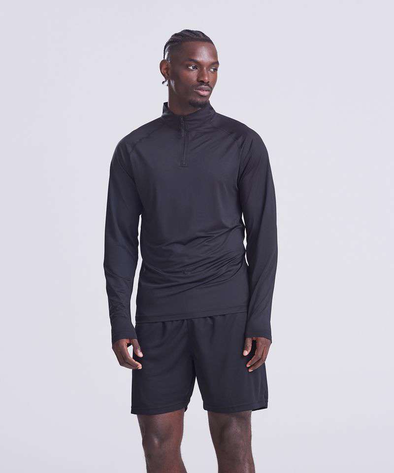 Raglan sleeves. Performance fabric. YKK 1/4-zip. Standard fit. Tear-away label. Quick-dry wicking fabric. Contains recycled polyester.