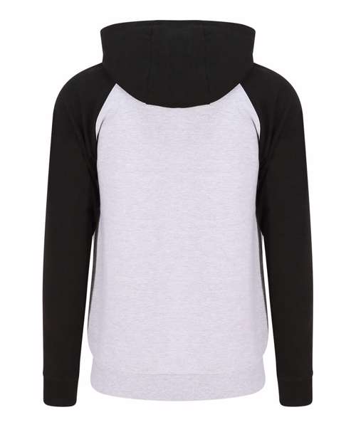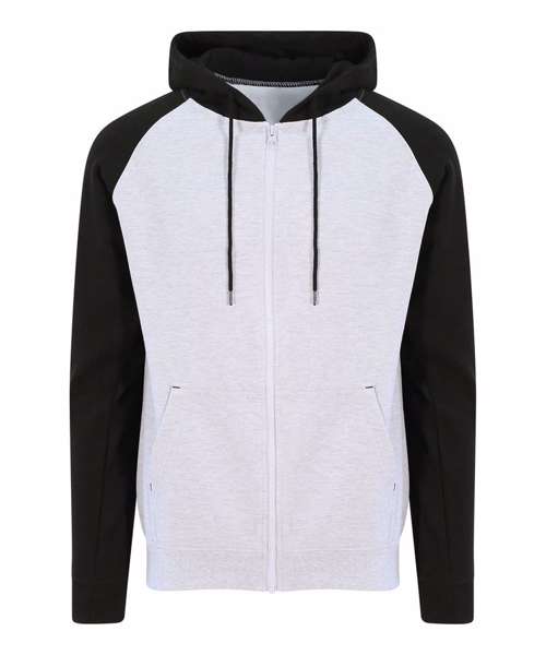 Twin-needle stitching detail. Contrast raglan sleeves. Double fabric hood. YKK plastic zip. Contrast flat lace drawcords. Spilt kangaroo pocket. Ribbed cuffs and hem. Soft cotton faced fabric creates ideal printing surface. Simple tear-out label makes it perfect for rebranding. Brushed inner fleece.