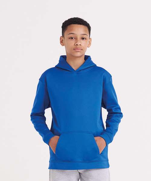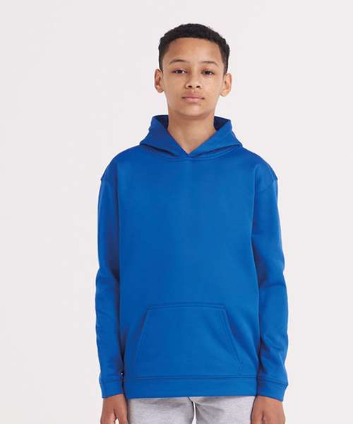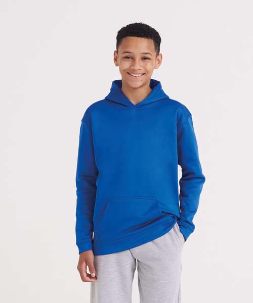 A warm and comfortable classic hoodie for kids. Featuring brushed back polyester, set-in sleeves and double fabric hood. Pair with jeans or joggers for a casual sporty look.