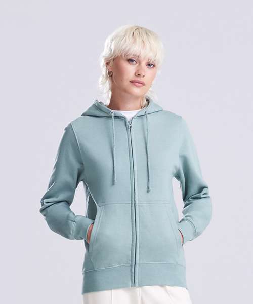 Full-zip zoodie. Women’s relaxed fit. Covered main plastic YKK zip. Twin-needle stitching detail. Double-fabric hood. Self-coloured drawcords. Kangaroo pouch pockets. Simple tear-out label makes it perfect for rebranding. Brushed inner fleece. Ribbed cuffs and hem. Soft cotton-faced fabric creates the ideal printing surface.