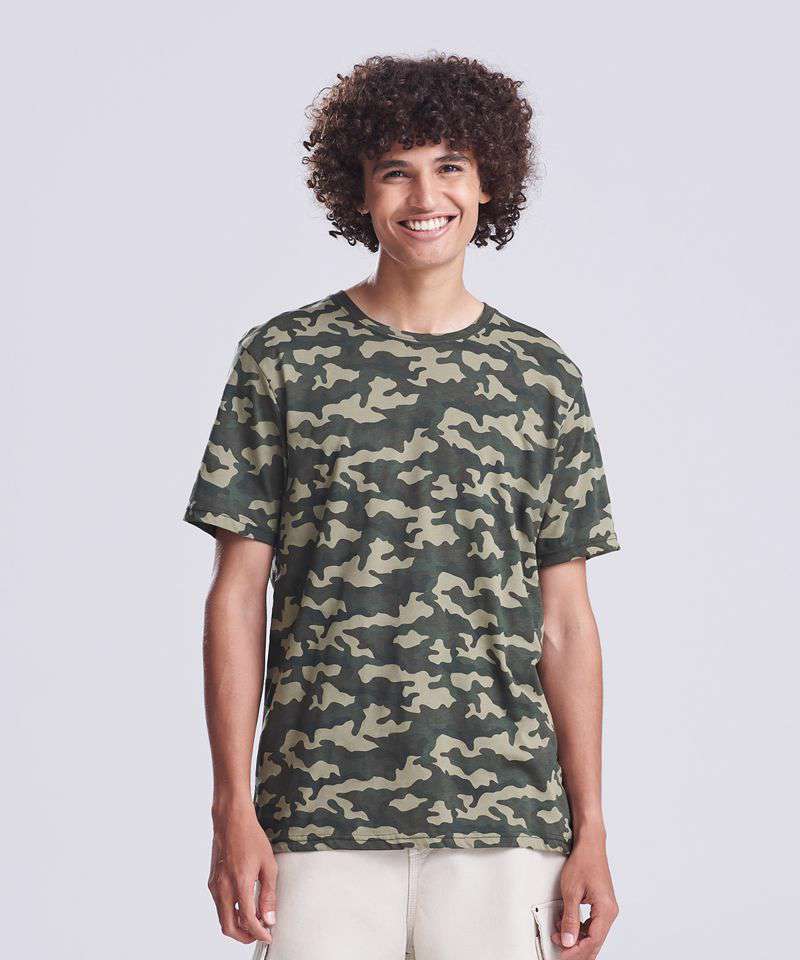 Modern fit short sleeved T. Size tab label. All over camo print. Taped neck. Twin-needle stitching on sleeves and bottom hem. Ribbed crew neck style. Side seams. Set-in sleeves.