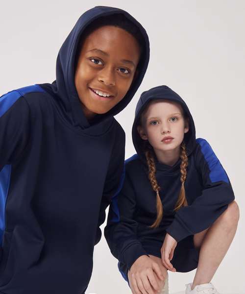 Unisex kids’ hoodie. Contrast sleeves and side panelling on contrast only. Ribbed cuffs and hem. Crossover hood neck at centre front. Zipped welt pocket in front panel side seam. Three-piece hood. Offered in contrast and solid colours. Tear-out label.