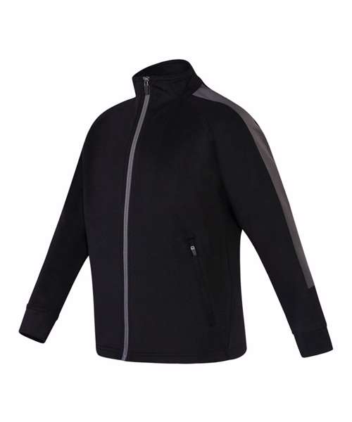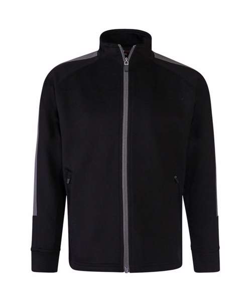 Knitted tracksuit top with contrast colour panels on outer sleeve. Contrast colour centre front zip. Zipped side pockets. Funnel neck and 1x1 ribbed cuffs. Semi-automatic lock zip sliders on all zips.