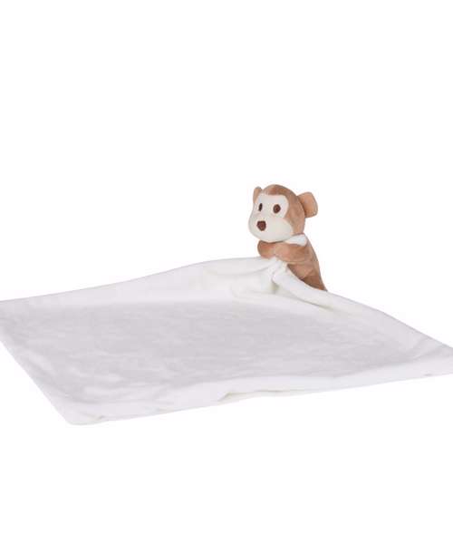 Baby monkey comforter with double fabric blanket. Zip access for embroidery. Monkey with soft filling. 33 x 33 cm blanket. Complies with EN71 European Toy Safety regulations. Remove all hang tags and their fasteners before giving these items to a child. Suitable for children of all ages.