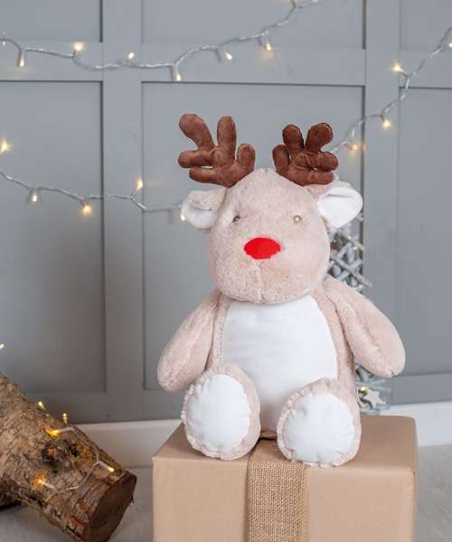 Soft plush reindeer. Contrast eyes and fabric contract nose. Contrast fabric antlers. Cream coloured panel on tummy and inner ears, and feet. Zip access on the base of the reindeer for direct access onto the tummy for embroidery. Removable inner stuffing. Can be embroidered or sublimation printed. Complies with EN71 European Toy Safety regulations. Remove all hang tags and their fasteners before giving these items to a child. Suitable for children of all ages.