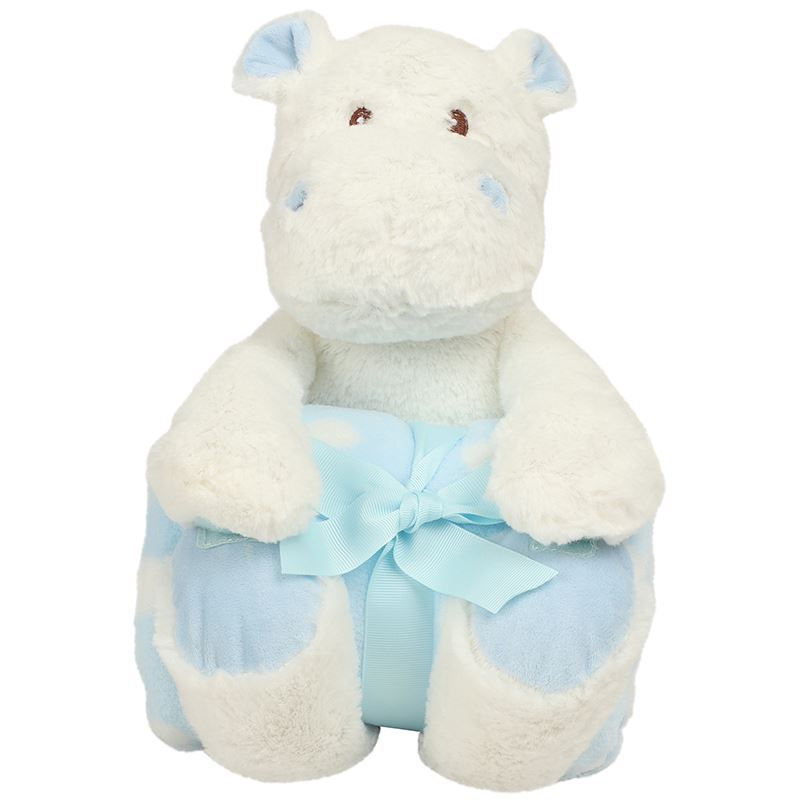 Soft plush hippo with contrast blanket. Contrast feet, nose, and horns. Sewn eyes. Hook and loop fastening on feet and paws. Blue and white spotted velour blanket. Complies with EN71 European Toy Safety regulations. Remove all hang tags and their fasteners before giving these items to a child. Suitable for all ages.