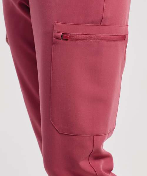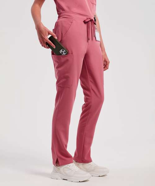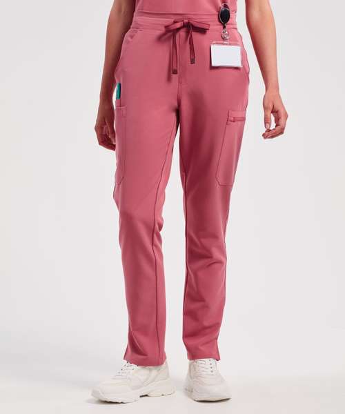 Women’s cargo scrub pants. Comfortable four-way stretch. Breathable, easycare, crease-resistant fabric. Part-elasticated waistband with adjustable drawcord and mock fly. Multiple mobile-friendly coin and zip pockets. Hemmed side vents. Decorate with embroidery and/or print. Contains certified recycled polyester.