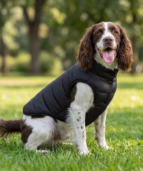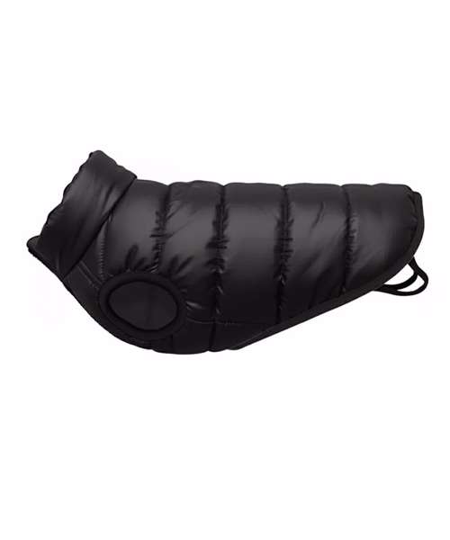 Padded puffer jacket with snap-popper attachment. Adjustable back leg straps. Reinforced slit so it can be worn over the harness. Back length: XS 25cm, S 30cm, M 35cm, L 40cm, XL 45cm, 2XL 50cm