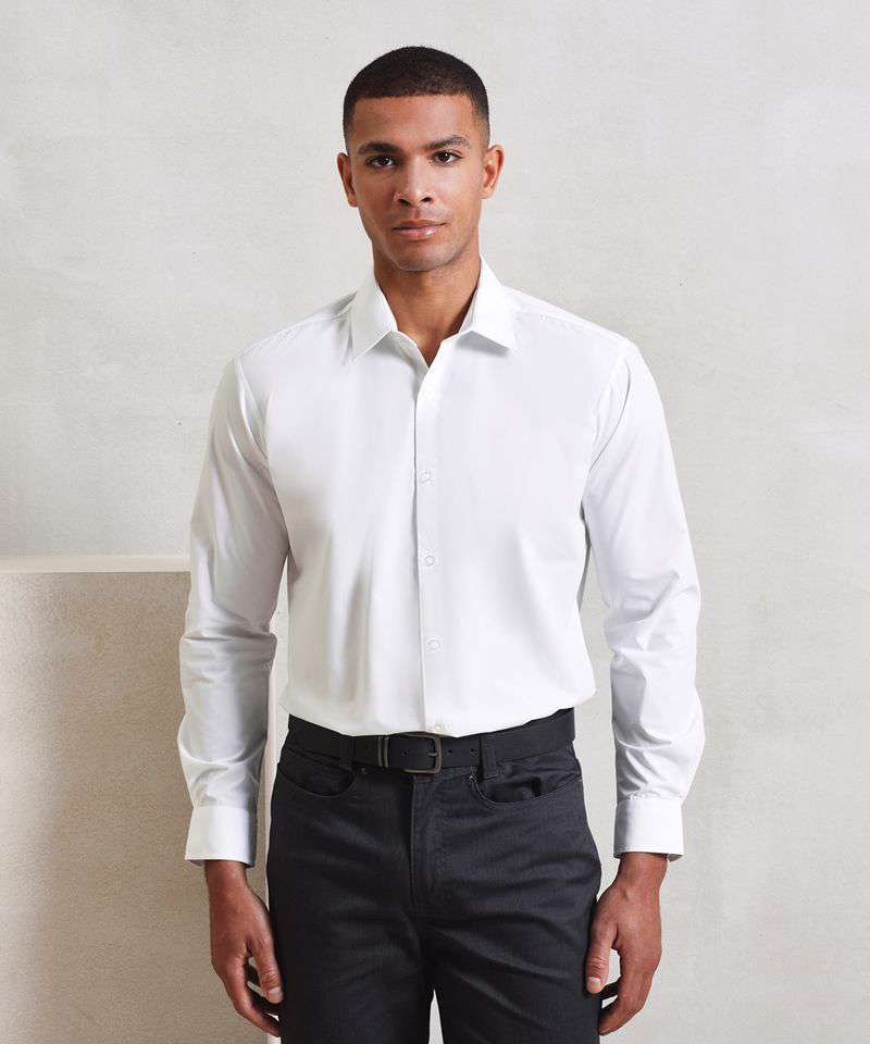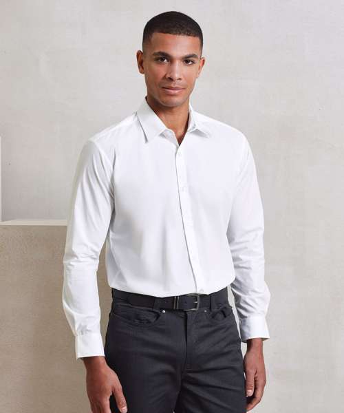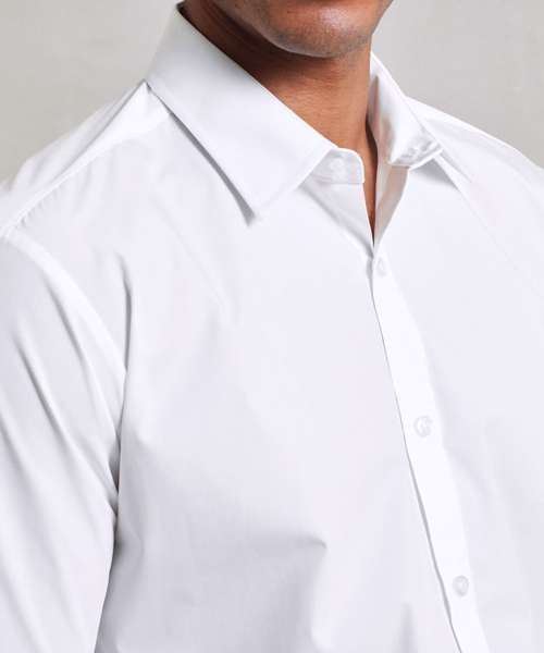 Supreme heavier weight Easycare poplin shirt with improved wear and appearance. Stiffened formal cut collar. Button fastened cuffs that will also fit cufflinks. Two button fastening detail on collar stand. Semi fitted styling. Easy cut-out label for rebranding.