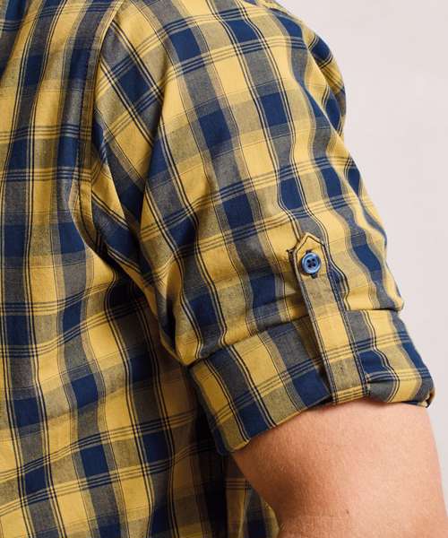 Long sleeve semi-fitted shirt for men with a multi-coloured contrast check pattern. Single button cuff and sleeve guard which is designed to be rolled up and secured in place with a button and tab on the upper arm. Soft collar styling with curved hem.