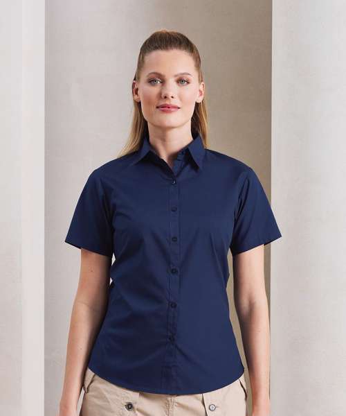A ladies short sleeved Poplin blouse with semi fitted styling, available in 30 colours. The blouse features soft collar styling with bust and back darts and a rounded bottom hem for an attractive piece of workwear for women.