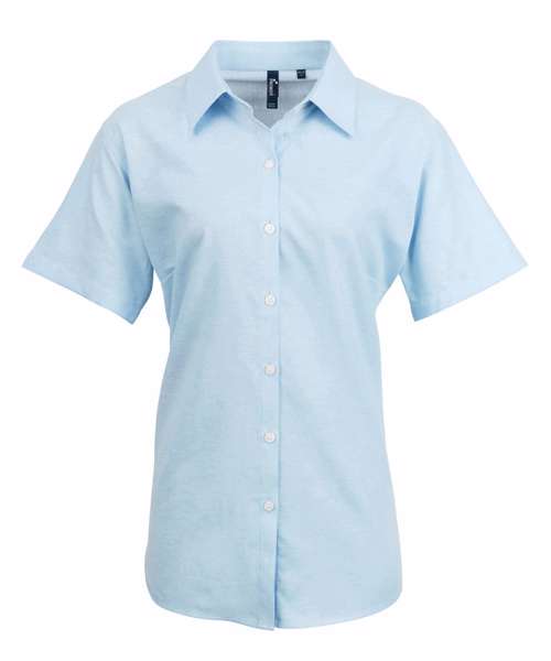 Ladies signature Oxford short sleeve blouse with wrinkle free finish for a smart and professional appearance. Soft collar styling. Rounded bottom hem. Fitted styling with bust and back darts. Pearlised buttons on light blue and white shirt, self colour buttons on remaining.