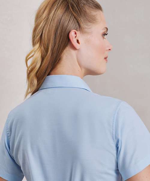 This short sleeve ladies Oxford blouse is an essential wardrobe item during the warmer months. Bust and back darts make for a flattering fit and the soft collar styling and rounded bottom hem ensure a feminine workwear blouse for women.