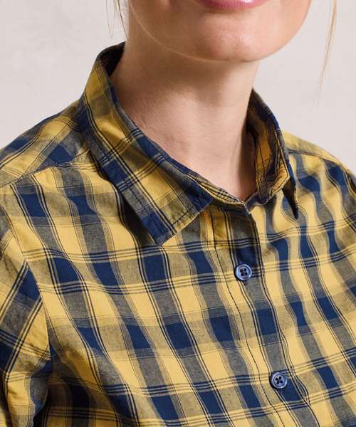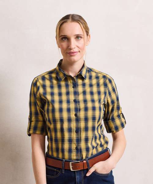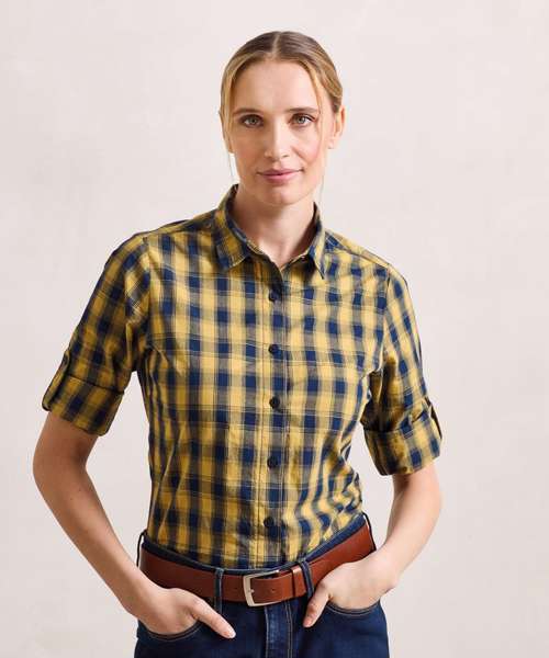 A women's long sleeve semi-fitted shirt with multi-coloured contrast check pattern. Single button cuff and sleeve guard which is designed to be rolled up and secured in place with a button and tab on the upper arm. Soft collar styling with curved hem.