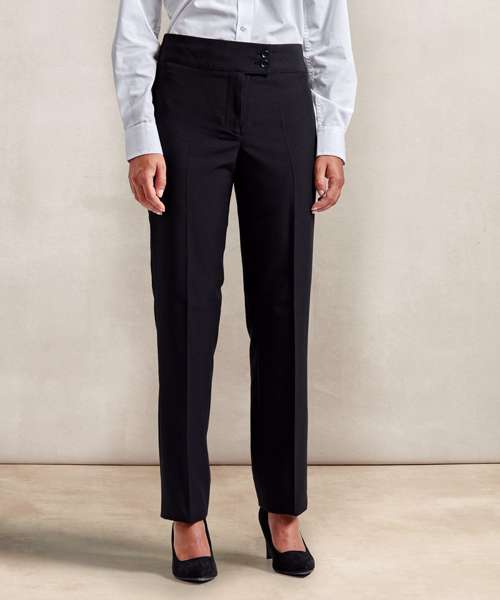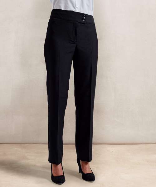 A straight leg trouser for women that features a deep waistband with cross-over tab and with two button fastening. Available in two leg lengths and four colours, this is great all round uniform trouser for women.