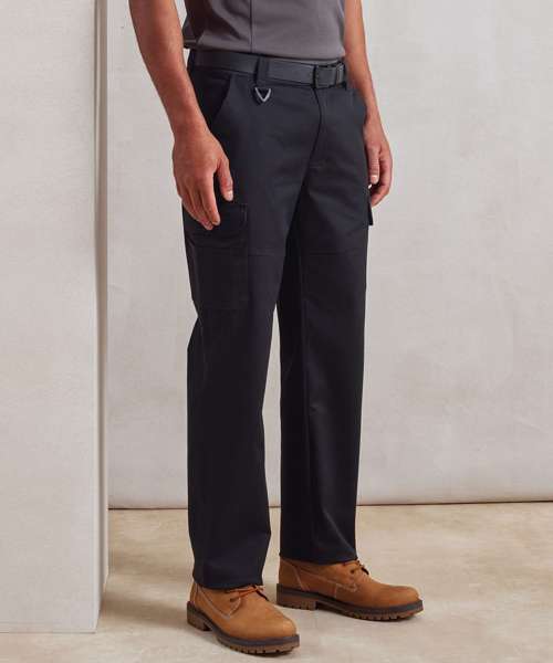 Durable work cargo trousers with Premier's Stretchchecker fabric for stretch and a comfortable fit. Belt loops and two-button fastening to the waistband. Covered YKK zip fly. Side sling pockets. Multiple mobile friendly, cargo-style pockets with hook and loop fastening. Single patch pocket to the reverse. Two leg lengths. Unisex styling. Contains certified recycled polyester.