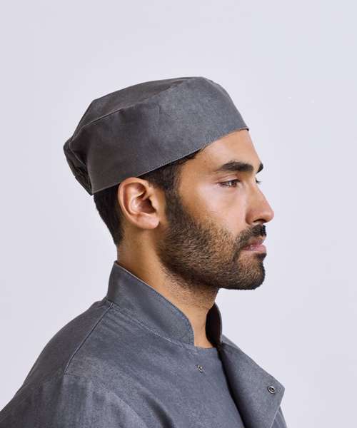 One size fits all. Flat top chef's skull cap. Elasticated back, crease resistant finish.