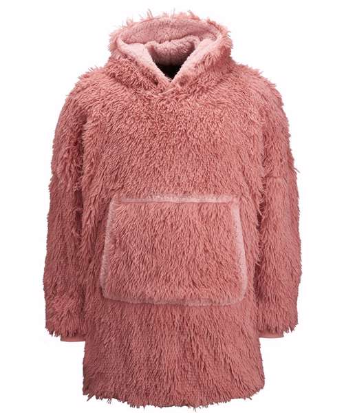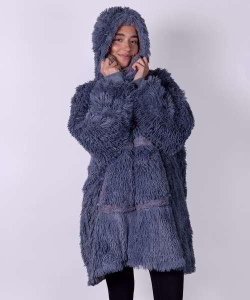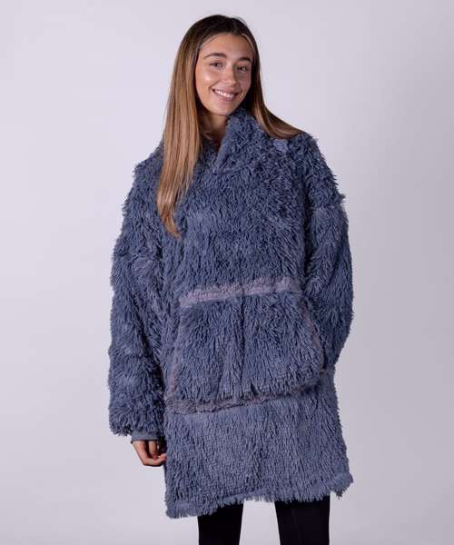 Super-shaggy faux fur with snuggly sherpa reverse. Large hood keeps your head warm and comfy. Oversized – one size fits most, including children – with large pocket to keep your hands warm as toast. Reversible – choose your favourite way!