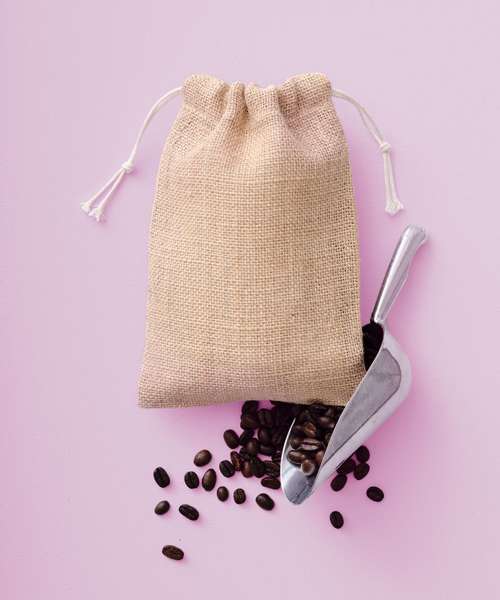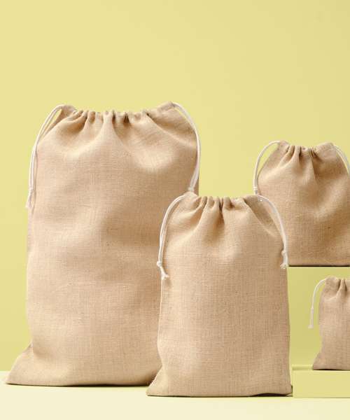 100% Jute, 300gsm. Double drawcord closure. Natural ties.