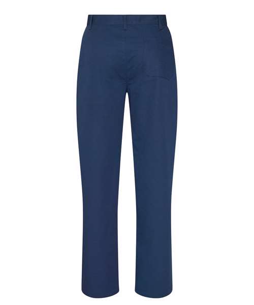 Clean, modern workwear trouser with two front pockets, one patch pocket at seat and waistband with belt loops. Made from a durable poly/cotton blend fabric.