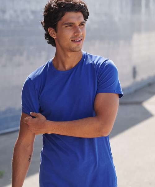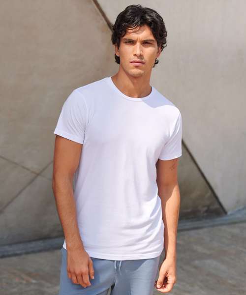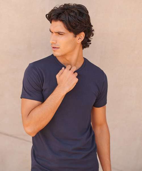 Feel good men's stretch t-shirt with enzyme wash for unique soft hand-feel. 96% cotton, 4% elastane for improved fit, comfort and shape retention. Modern long-line fit. Crew-neck with back neck binding and soft stretchy rib neckline. Features tearable removable label.