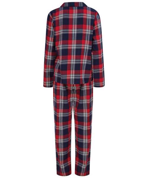 Woven tartan lounge set with plain hem. Shirt with a pyjama collar and pearlised button front, and bottoms with a full elasticated waist. Tear-out label.