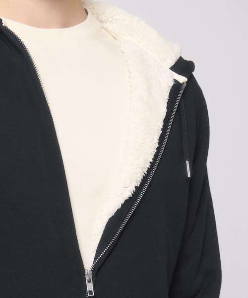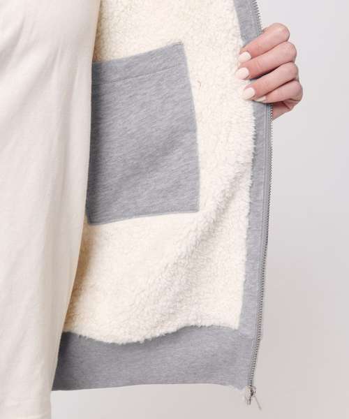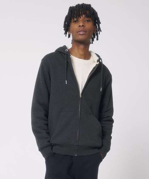 Unisex sherpa lined zip-through hoodie sweatshirt. Set-in sleeve. Lined hood in recycled sherpa. Round drawcords in matching body colour with metal tipping. Metal eyelets. Inside herringbone back neck tape in greige colour. Self-fabric half-moon at back neck. Covered metal zip at centre front. 1x1 rib at sleeve hem and bottom hem. Armhole, sleeve hem and bottom hem with twin-needle topstitch. Kangaroo pocket at front. Fully lined with recycled sherpa inside chest pocket. Inside invisible zip at bottom hem for easy decoration.