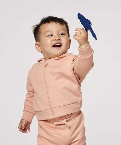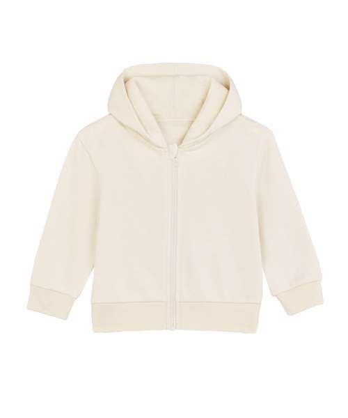 Baby zip-through sweatshirt with set-in sleeve. Lined hood in single Jersey.