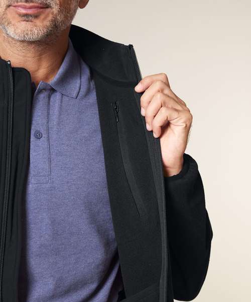 Set-in sleeves. Elastic binding at cuffs and hem. Inside back neck binding loop and back neck tape. Nylon coil zip with metal zip pull and cord ending. Brushed polar fleece fabric with anti-pilling finish on the inside and outside. Front side welt pockets with hidden zip closure. Contrast softshell fabric at the yoke and outer collar. Inside invisible zip at the wearer’s left chest for easy decoration.