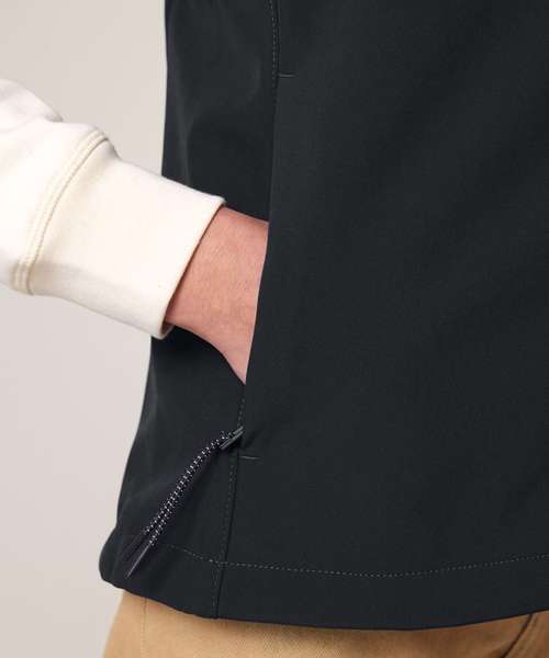 High collar. Bottom hem with adjustable plastic stopper and elastic cord. Reverse nylon zip at centre front. Zipped outside welt pockets with reflective elastic zip pull. Fully bonded inside fleece layer with an anti-pilling finish. Side panels and stretch for better shape. Inside seams finished with recycled binding. Water-repellent bottom hem with adjustable plastic stopper and elastic cord. Water-repellent. Breathable and windproof.