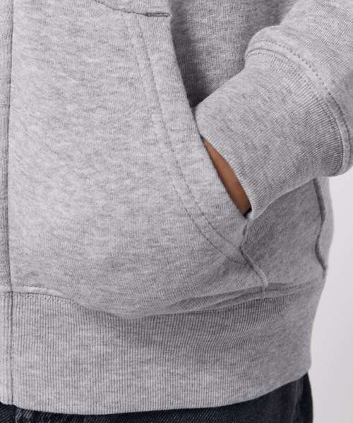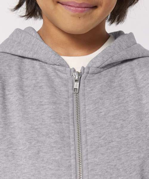 The iconic kids’ zip-thru hoodie sweatshirt. Medium fit. Set-in sleeve. Self-fabric lined hood. 1x1 rib at sleeve hem and bottom hem. Twin-needle topstitch centred on seam at hem, cuff and armhole.