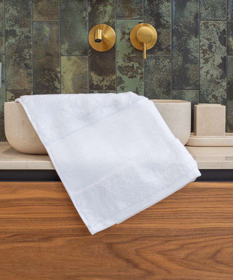 Luxury, heavyweight, organic cotton hand towel with 11cm border area for easy decoration. Dobby design, beautifully soft hand feel and highly absorbent, with hanging loop.
