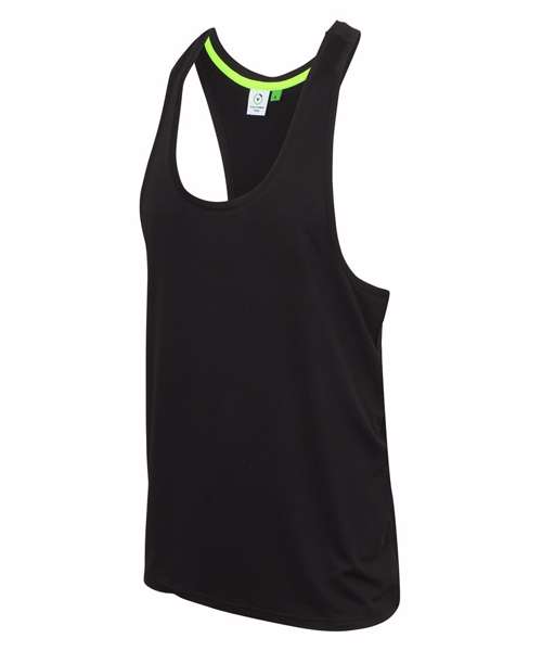 Shaped work out vest, lightweight soft hand feel fabric, self fabric binding, tear-out label.