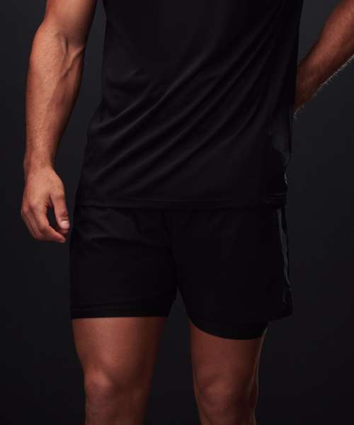 Men’s double-layer sports shorts with four-way stretch. Microfibre top short and polyester interlock under short. Side zipped welt pockets. Self-fabric elasticated waistband with inner drawcord. Side vents. Integrated under short. Phone pocket on under short, right-hand side when worn with media access. WIcking properties on under short. Tear-out label.