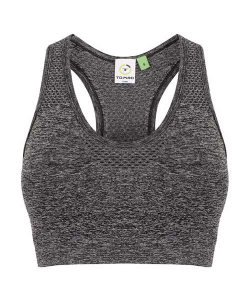 Seamless bra with removable padded cups and racerback. Self- fabric mesh inserts on front straps, V insert on front and on racerback panel. Self-fabric binding around neck, armholes and back. Tombo tear-out label.