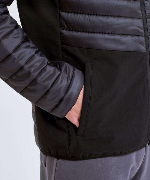 Hybrid jacket with diagonal quilted upper chest and full back. Lower jacket is shell fabric. Full zip-through style with panelled hood. Hood is elasticated for a snug fit. Front pockets. Elasticated hem. Quilted detailing to arms with lower arm in shell fabric. Internal storm flap with zip guard. We recommend using block out vinyl and inks.Product contains no branded neck or waist label. Removable Kimble or looped garment tags. Inner seam label holds important product information on one label with a second label containing brand information which can be cut-away.